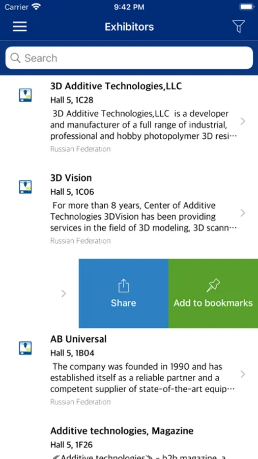 · Favorites tab — to save boothes or events and share it with colleagues.