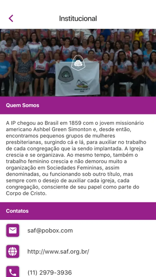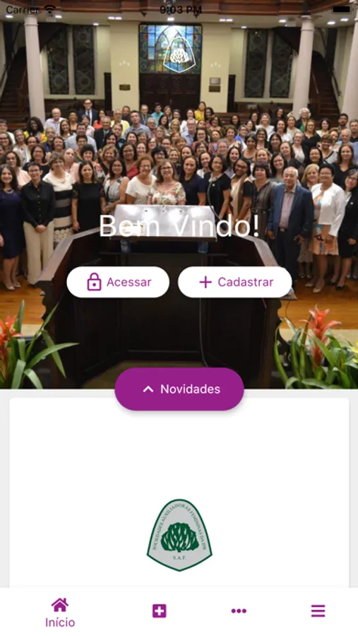 Seja muito bem-vindo ao ao aplicativo da SAF (Sociedade Auxiliadora Feminina). Aqui você pode conhecer mais sobre nossa comunidade, boletins, notícias, mensagens etc.