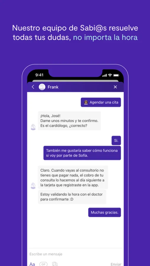 Desde la app puedes resolver tus dudas 24/7, tomar videoconsultas ilimitadas, o si lo necesitas, agendar una visita con un@ de nuestr@s doctores. ¡Tenemos más de 90 especialidades!