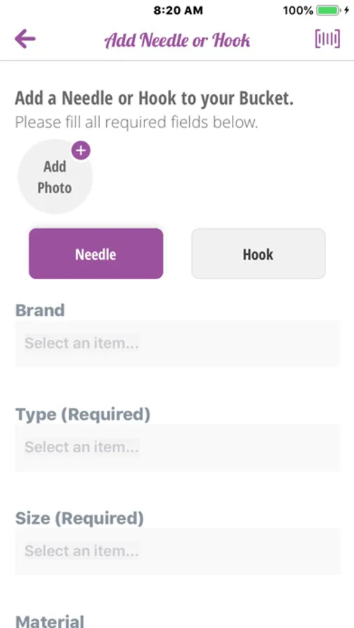 Barcode scanning: Add new needles and Hooks to your bucket quickly and easily by scanning the barcode.