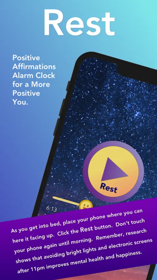 The app works by first setting a wake-up time, then the app calculates the optimal bedtime. At night, plug in your phone to charge, press the Rest button to start the affirmations and simulated sunset. With the app left open, it will wake you in the morning, with uplifting affirmations, prayers of gratitude and motivational music to start your day in a positive way.