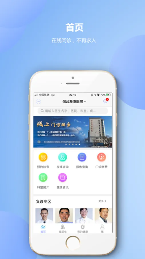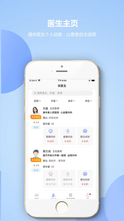 【科室、疾病找医生】提供详细的医院相关科室信息;支持按姓名、科室、疾病、擅长等查找医生。