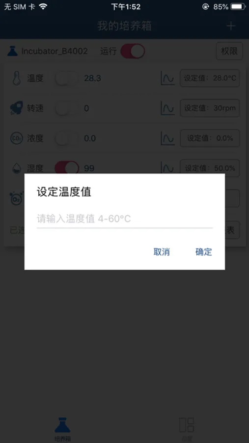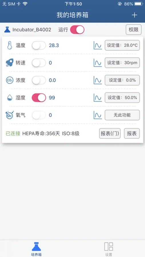 CO2培养箱远程监控APP软件是美国精骐公司开发的软件,该软件运行在搭载iOS 10.0以上系统的手机上,用以监控CO2培养箱运行状态的软件。该软件具有很好的人机交流界面,用户易懂,操作方便。可以同时对单台机器或多机同时远程监控,降低人工监控成本。CO2培养箱远程监控APP软件可监控CO2培养箱的温度、转速、CO2浓度、湿度、光照、运行时间及相关报警信息(如温度报警、转速异常报警、CO2浓度报警等),不论是在机器上还是手机上对设备进行操作,所有信息都可及时反馈到APP中,全方位监控机器的情况,以保证设备正常运转,同时具备设置设备各种运行参数运行设定,所有的设备历史数据都可提供查询,为GMP和FDA认证提供有用的信息。