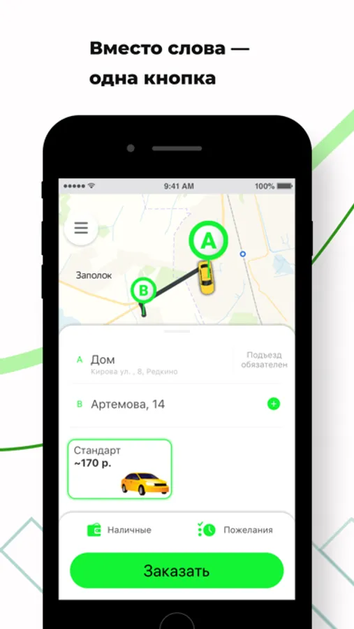 Откройте приложение, укажите адрес и закажите такси, нажав на одну кнопку.