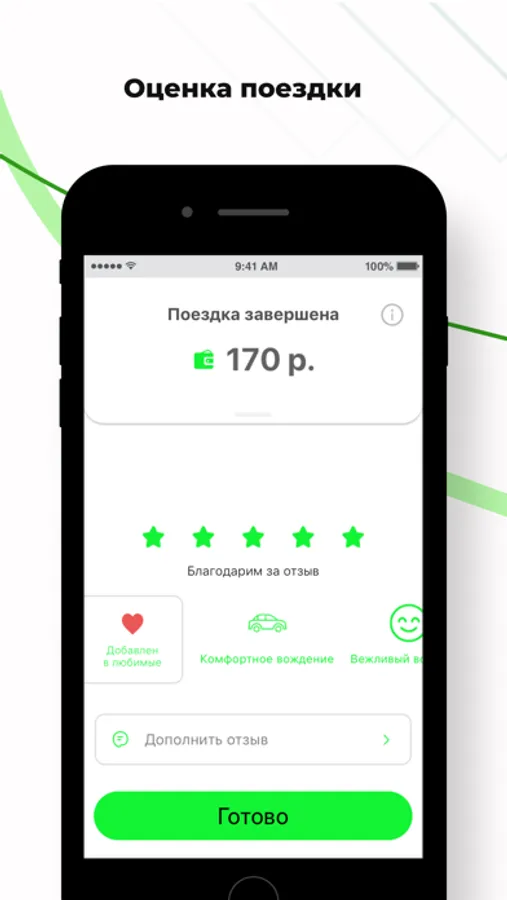 Оценивайте поездку с помощью готовых шаблонов. Занесите водителя в “Избранные”, если понравилась поездка.