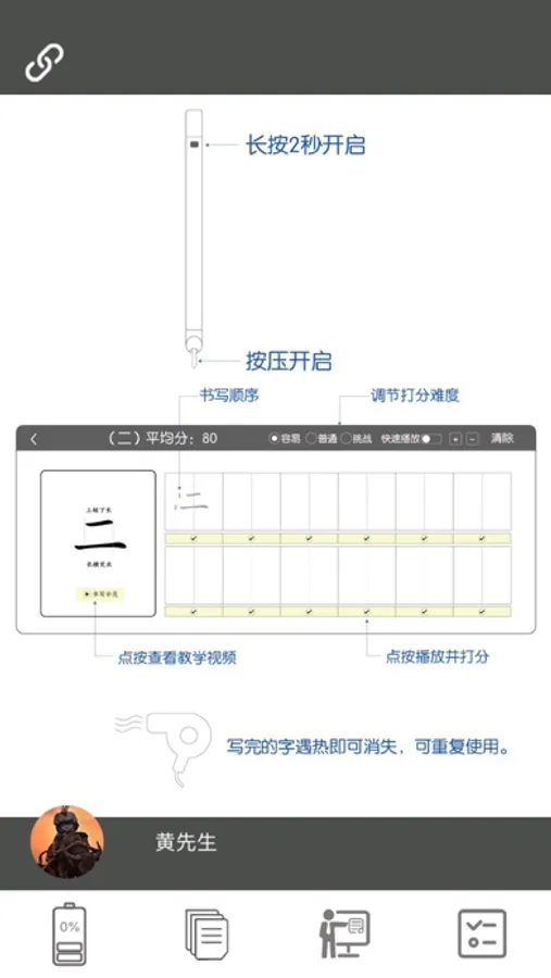 一笔好字练习系统,在不改变用户手写习惯的情况下,通过蓝牙连接智能手写笔,帮助用户锻练写字的习惯,修正书写字体的误区,用户经过学习系统练习,一定能写出一笔好字。