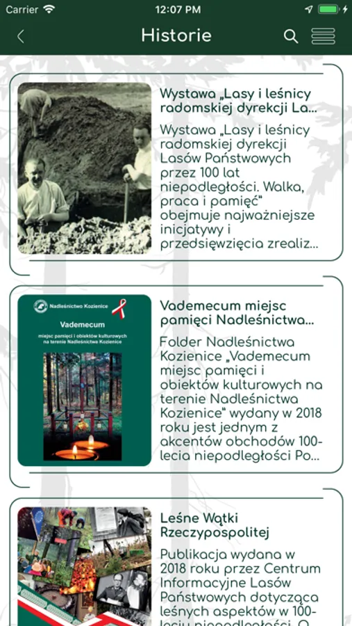 W ramach projektu „Las historii. Czy wiesz, że?” na stronie internetowej i w aplikacji mobilnej zawarte zostały informacje o miejscach pamięci narodowej oraz innych miejscach wartych odwiedzenia na terenie 23 nadleśnictw Regionalnej Dyrekcji Lasów Państwowych w Radomiu, położonych w obrębie województwa świętokrzyskiego i południowej części Mazowsza. W regionie tym nie ma nadleśnictwa, na którego terenie nie byłoby kilkunastu, kilkudziesięciu obiektów upamiętniających wydarzenia, których świadkami były lasy. Razem na terenie RDLP w Radomiu jest ich ponad 400. Wśród nich są cmentarze, mogiły, pomniki, krzyże i inne obiekty z okresu powstania styczniowego, I i II wojen światowych, okresu powojennego, a także postacie zasłużone, a także inne miejsca ważne z punktu widzenia wydarzeń historycznych.