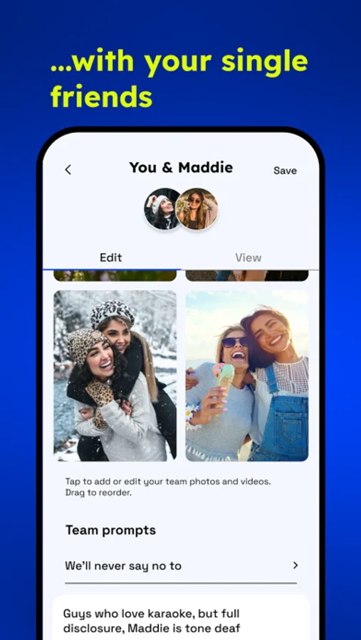 Together you and your friend can show some personality and showcase your relationship by answering your team prompts and adding photos to your team profile. Unlike profiles on other dating apps your Fourplay team profile will include both you and your friend. Don’t overthink it and don’t put too much pressure on yourself. Just have fun!