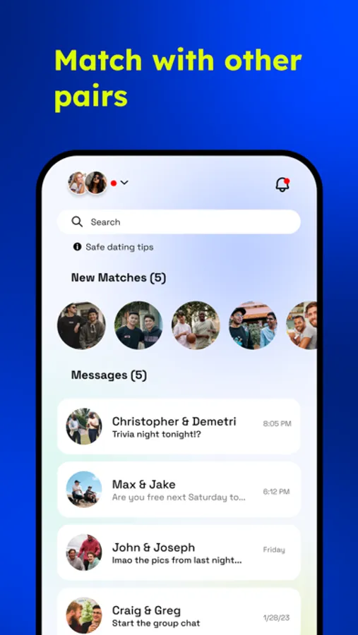 Looking to expand your circle of single friends? We get it. Looking for a relationship but want to vet your matches IRL before committing to an unpredictable one-on-one date? That’s why we let you bring a friend. Not looking for a relationship? Just have some fun where the stakes are low. No judgment from us (but please be safe). Nervous or scared to use a dating app alone? Double dates and group chats with a friend help take the pressure off.