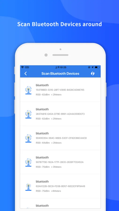 1.It scan Bluetooth devices around you and display device name,device unique UUID to help you distinguish what you are looking for.