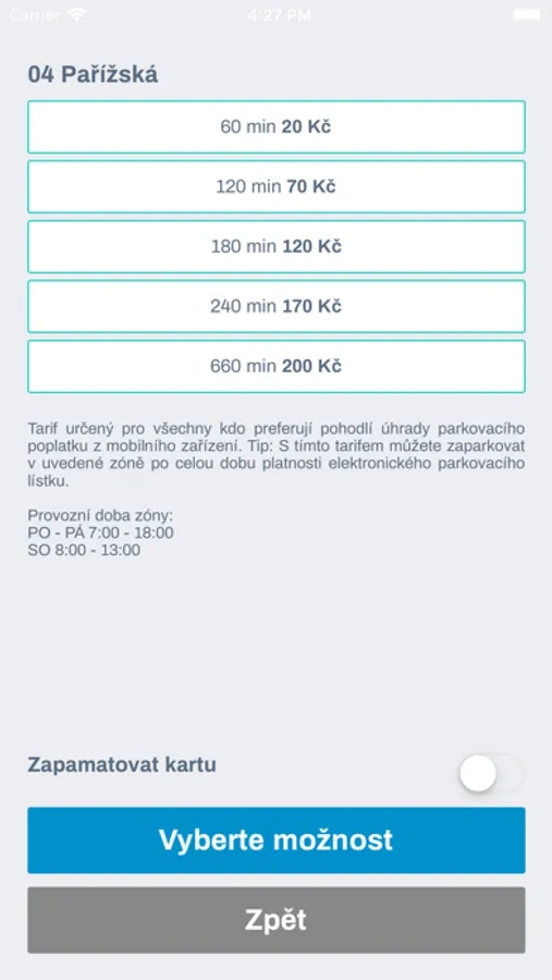 Aplikace si dle přání uživatele dokáže platební kartu po alespoň jedné úspěšné a plně autorizované platbě zapamatovat a tak další pořízení parkovacího lístku ještě rychlejší a pohodlnější.