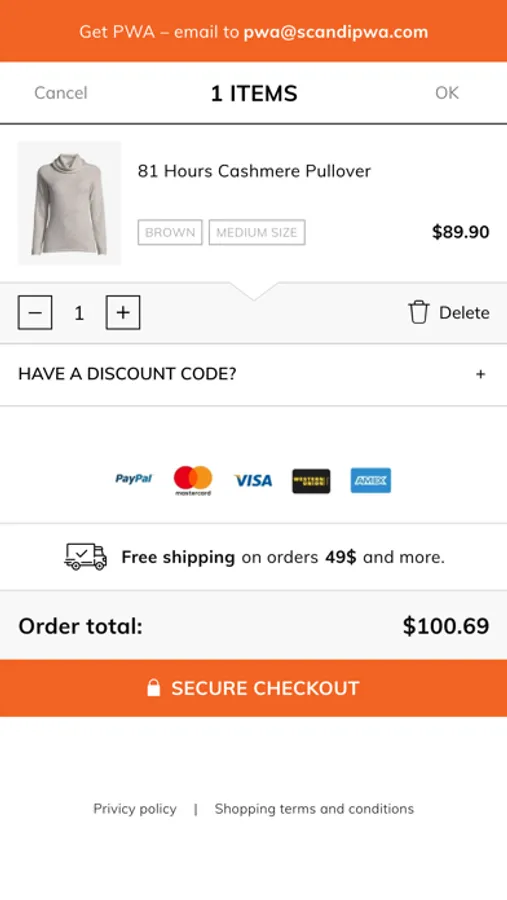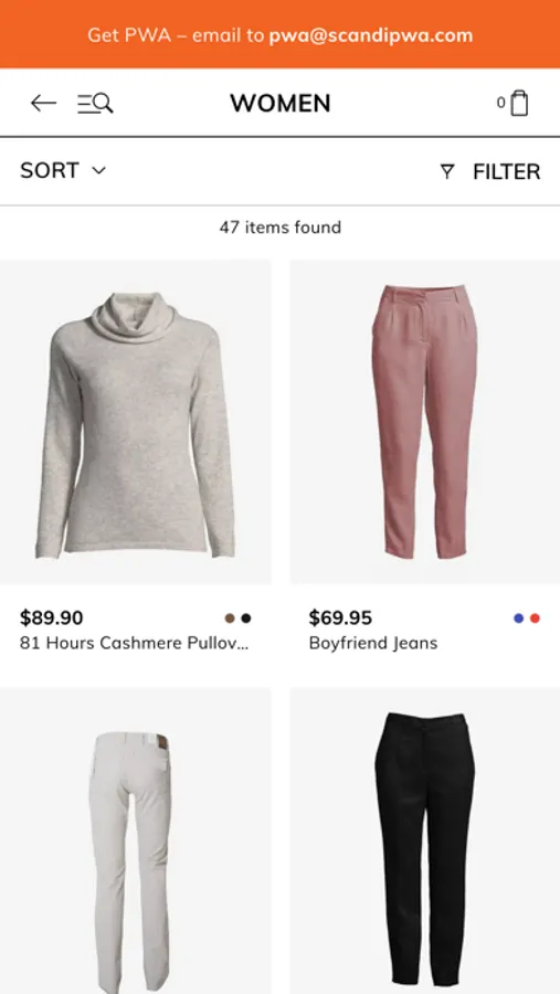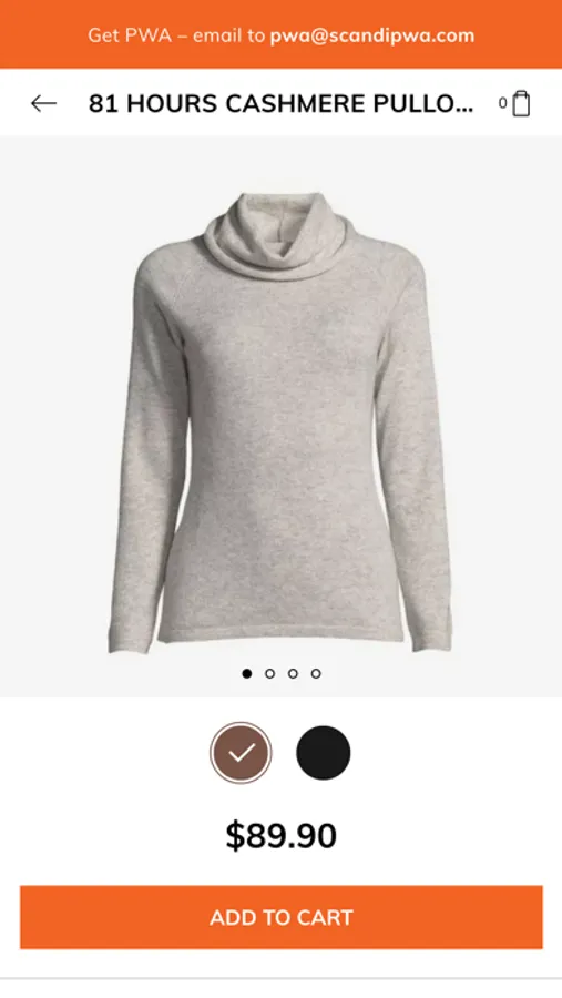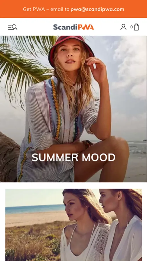 ScandiPWA is the first PWA solution shipped as an application allowing users to receive order update notifications, back in stock notifications and price alerts on selected products as well as additional functionality such as QR code scanning for easier product lookup. Further, it allows offline browsing and submitting checkout while offline that will be sent to the server, when the device is back to online mode.