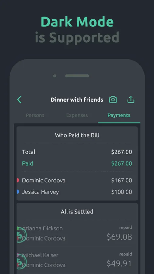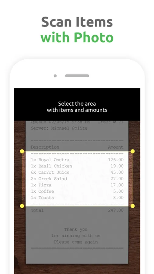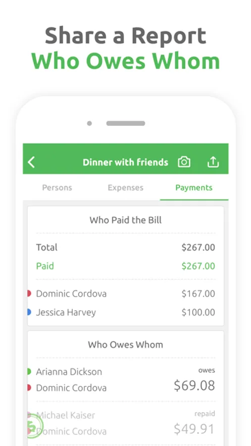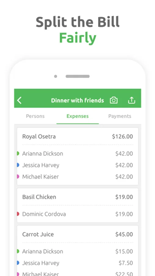 Fairsplit helps to settle up in this case. Just scan the bill with a photo, assign items to persons and choose who paid the bill. Then you will see a list of settlements — how much who owes to whom. You can share it with friends.