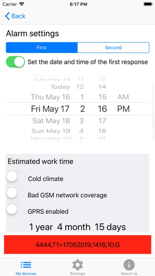 5) Approximate work time calculator of the device, depending on the alarm settings;