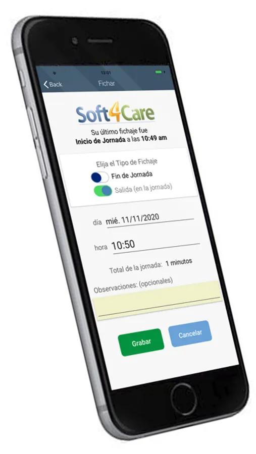 Mediante esta aplicación puede usar un dispositivo móvil como reloj de fichaje, permitiendo registrar la hora de entrada y salida de sus empleados.