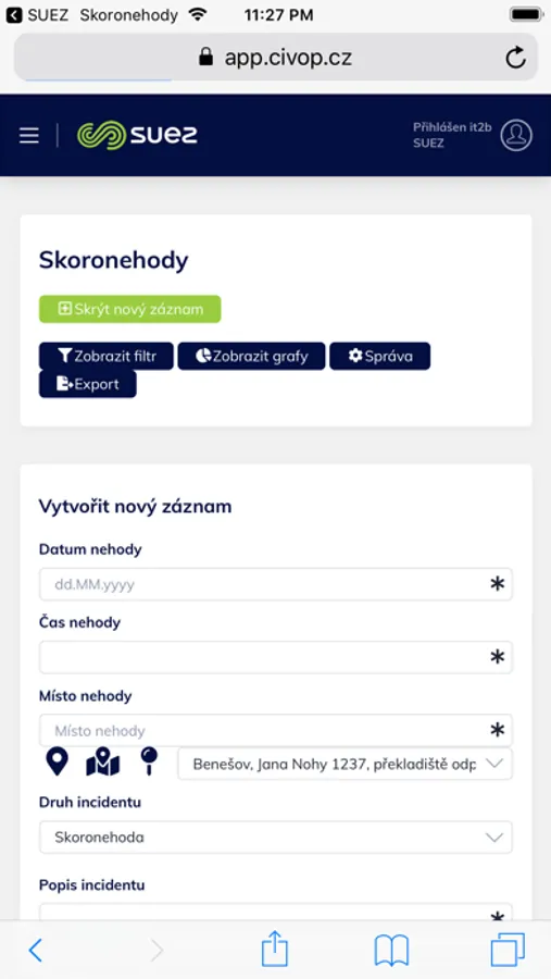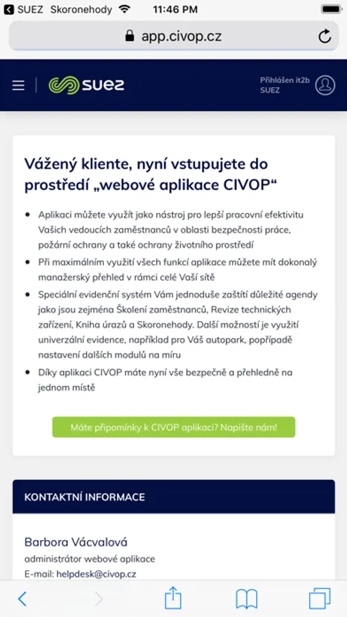 Aplikace slouží pro přihlášení do webové aplikace pro zadávání a správu skoronehod. Mimo zadávání skoronehod je možné procházet celou webovou aplikaci a nahlížet na přehled úloh, zprávy z kontrol, závady, dokumentaci a další informace.
