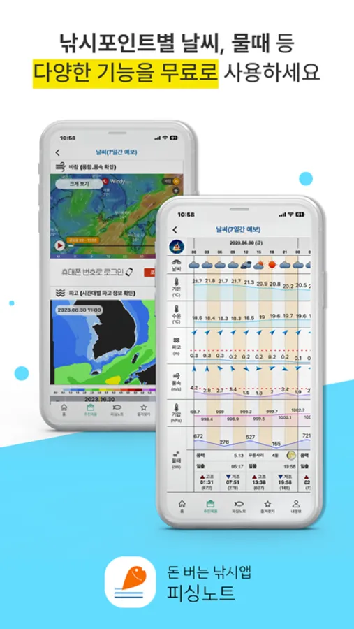 ‘피싱노트’는 여러분의 안전하고 즐거운 피싱 라이프를 위해, 물때와 날씨, 낚시 포인트 등 낚시에 필요한 모든 기능을 무료로 제공하고 있습니다.