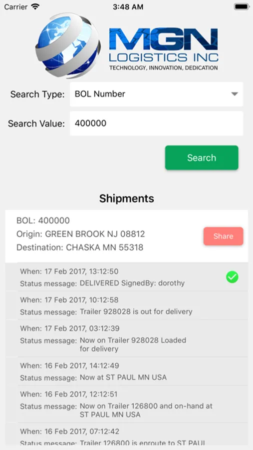 This app allows MGN Logistics customers to check the status of their freight shipments as well as share that information with their customers and associates. Shipments can be searched by BOL number, PO number or sales order number, or the carrier's tracking number.