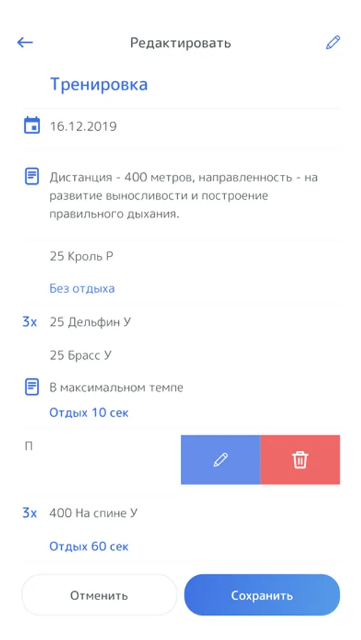 • Создавайте и редактируйте индивидуальные тренировочные занятия по плаванию
