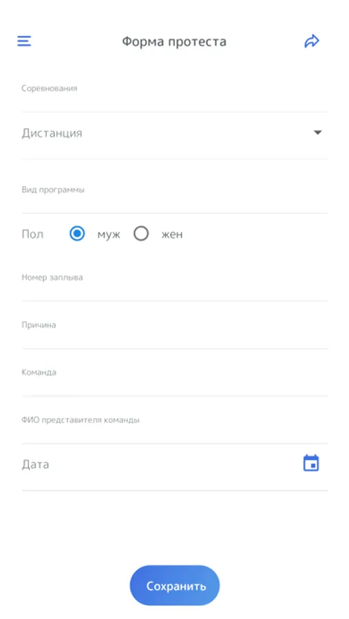 • Быстрый и удобный способ заполнения формы протеста, в соответствии с правилами Международной федерации плавания (FINA), с возможностью сохранить заполненную форму в формате PDF для печати, либо поделиться ею.