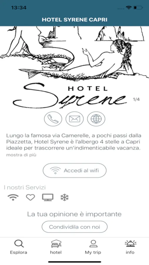 Hotel Syrene aiuta gli ospiti della struttura a sentirsi come a casa. Accedi a tante offerte e servizi pensate appositamente per te e per la tua famiglia. Programma la tua vacanza ancora prima di arrivare sul posto accedendo ad una serie di proposte esperienziali uniche. Prenota e scopri cosa ti riserva il posto intorno a te. Con questo innovativo canale di comunicazione sarai sempre in contatto con il personale della struttura. Hotel Syrene, vi augura un piacevole soggiorno.