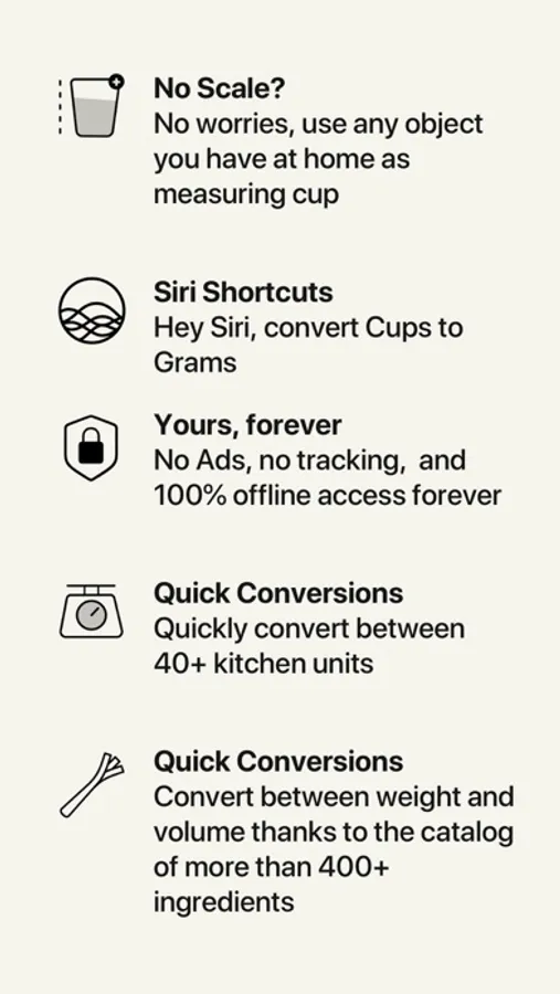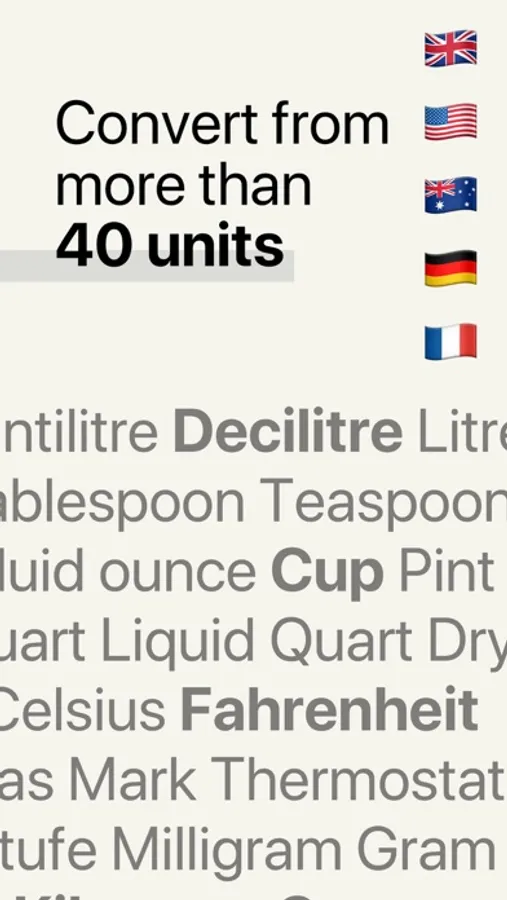 Units lets you quickly convert between 40+ kitchen units, including volume to weight conversions thanks to a growing catalogue of 400+ ingredients.