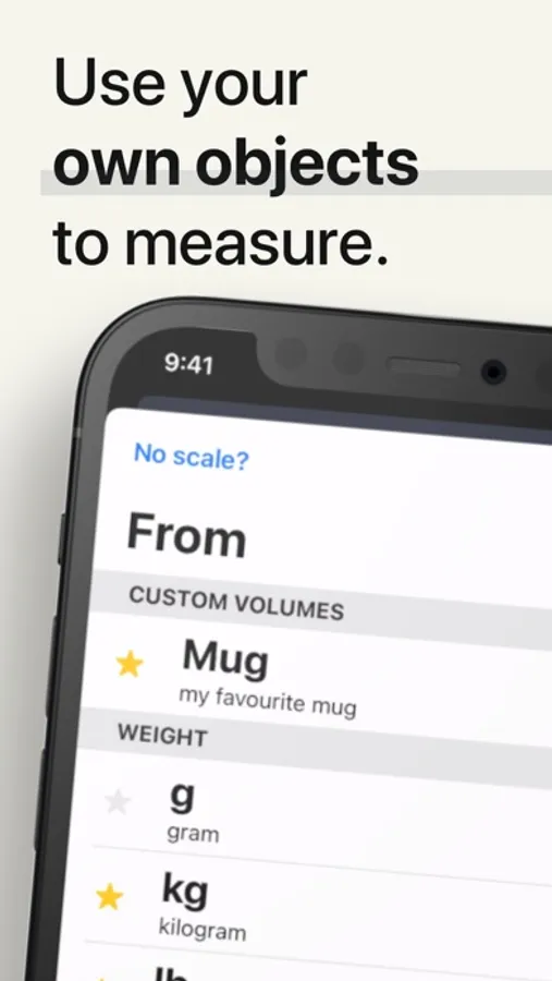 Additionally, if you don't have a scale or a measuring cup at hand, you can register your own container and Units will tell you how many of those you should use for your recipe.