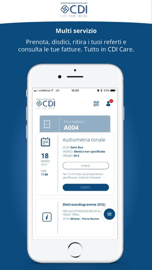 Prenotazioni: nella sezione prenota online puoi selezionare sede, medico e tipo di visita disponibili, puoi visualizzare le prenotazioni attive e disdire. A pochi giorni dalla visita riceverai notifiche con il promemoria dell’appuntamento e la documentazione da presentare.