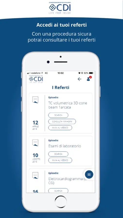 Gestisci i referti da mobile, puoi scaricarli e inviarli direttamente al tuo medico curante. Sei sempre aggiornato, ricevi notifiche, comunicazioni e informazioni personalizzate.