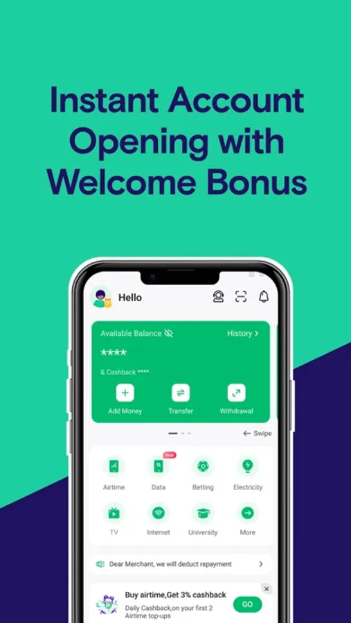 - Open an account instantly with your phone number, NIN, BVN, or other national means of verification