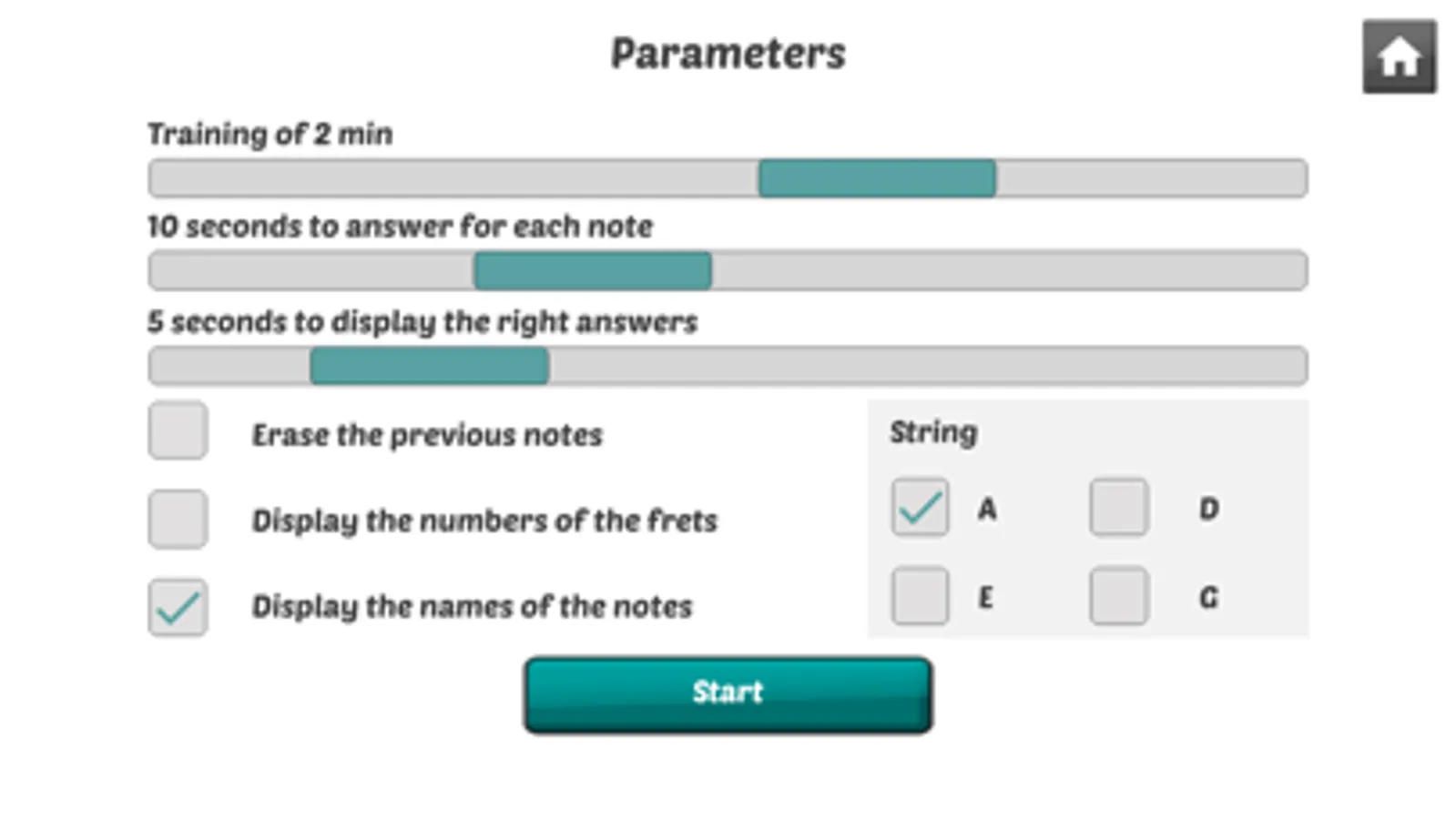 - Selection of the strings to train: Practice just one string or the entire fretboard.