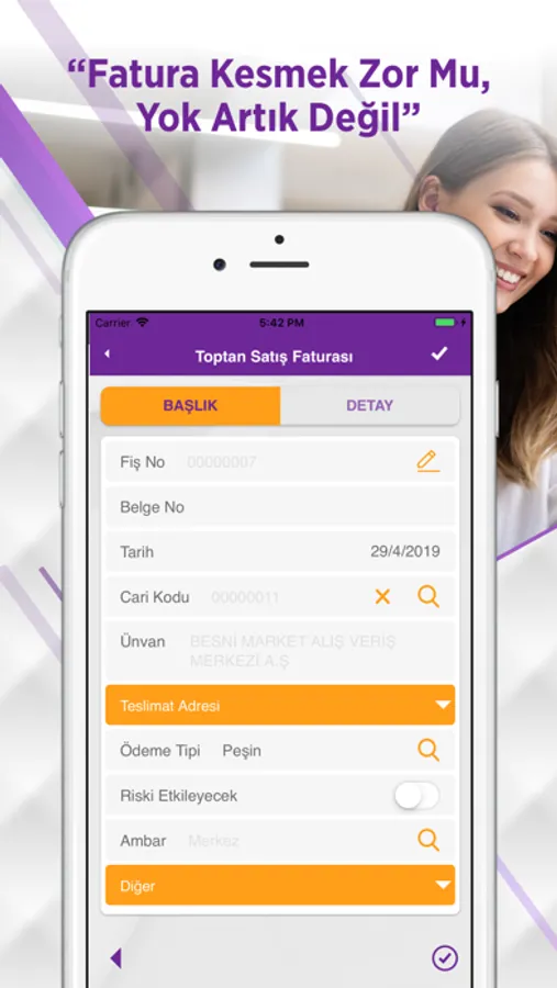 Müşterilerinize İster kağıt fatura ister e-Fatura, e-Arşiv olarak Toptan , Perakende Satış , Satın Alma , Alınan veya Verilen Hizmet faturaları düzenleyebilir, yazdırabilir, iade ve iptal edebilirsiniz. PDF dosya olarak e-Mail veya WhatsUp ile paylaşabilirsiniz. Fatura kayıt esnasında henüz kayıtlarınızda bulunmayan müşteri, ürün ve diğer tanımları anlık ekleyip Fatura kaydına kesintisiz olarak devam edebilirsiniz.