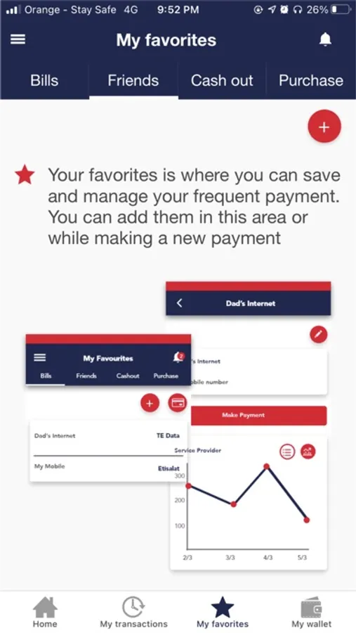 9. امكانية حفظ الخدمات المفضلة مثل الفواتير، حوالات للأقارب والأصدقاء، التجار