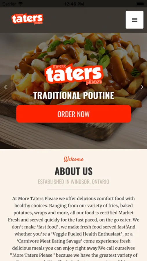 We call ourselves "More Taters Please" because we have the greatest variety of Taters around. We offer baked potato, a variety of fries, poutine, even wraps and more.
