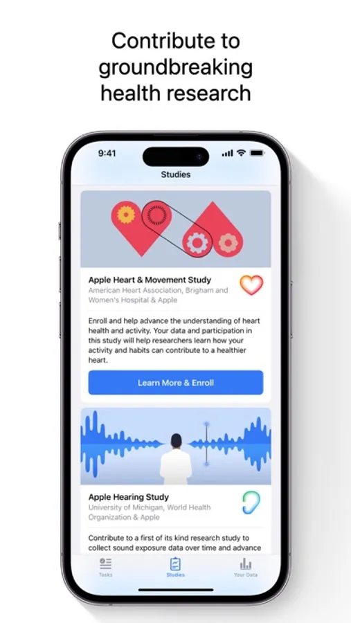 The future of health research is you! Now you can contribute to groundbreaking health research in women’s health, hearing health or heart health simply by using your Apple Watch and iPhone, and the Research app. Your data and participation will help advance researchers' understanding of these areas in health that have not been well understood until now and could lead to the development of new products that will help millions lead longer and healthier lives.