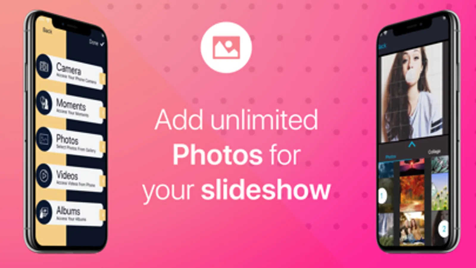 Add an unlimited number of images of your preference through your phone camera, moments or photos from the phone gallery. You can also choose your phone videos if you want.
