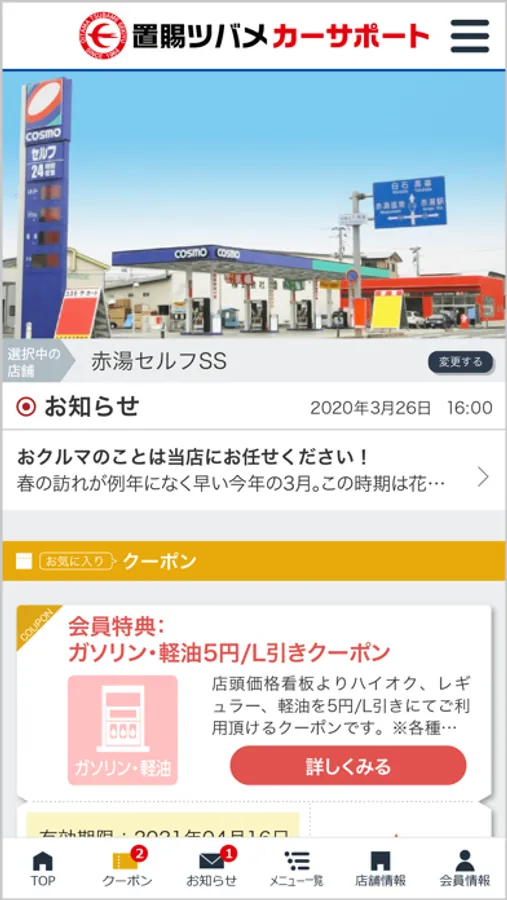 当社の公式アプリ「置賜ツバメ石油カーサポートアプリ」ではアプリで簡単に洗車・コーティングなどのご予約や愛車のメンテナンス管理が可能の他、ご登録いただいた店舗で利用いただけるお得なクーポンや各種メニューの割引情報を配信しております。