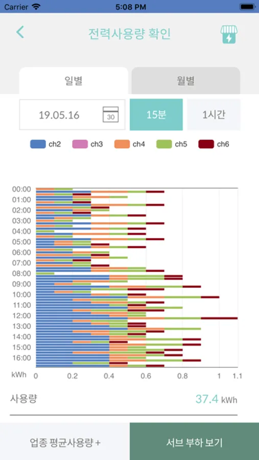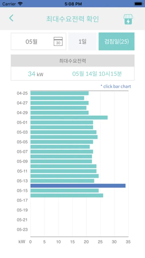 : 우리 매장의 전력사용량과 최대수요전력을 확인할 수 있습니다. 그래프를 터치하면 데이터를 텍스트로 볼 수 있습니다. 15분 단위, 60분 단위로 볼 수 있는 일별과 1일, 해당 검침일 기준으로 볼 수 있는 월별로 구분하여 확인 가능합니다.