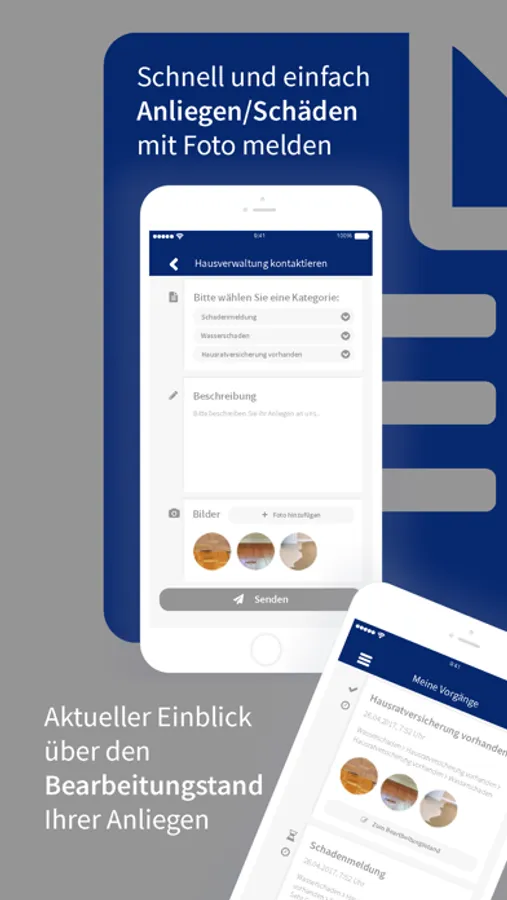 Als Mieter oder Eigentümer können Sie Schäden oder Anliegen direkt mit Fotos über unsere App melden. Ihre Anfragen stehen unseren Mitarbeitern dann zur Bearbeitung zur Verfügung und können auch an Handwerksbetriebe weitergeleitet werden.