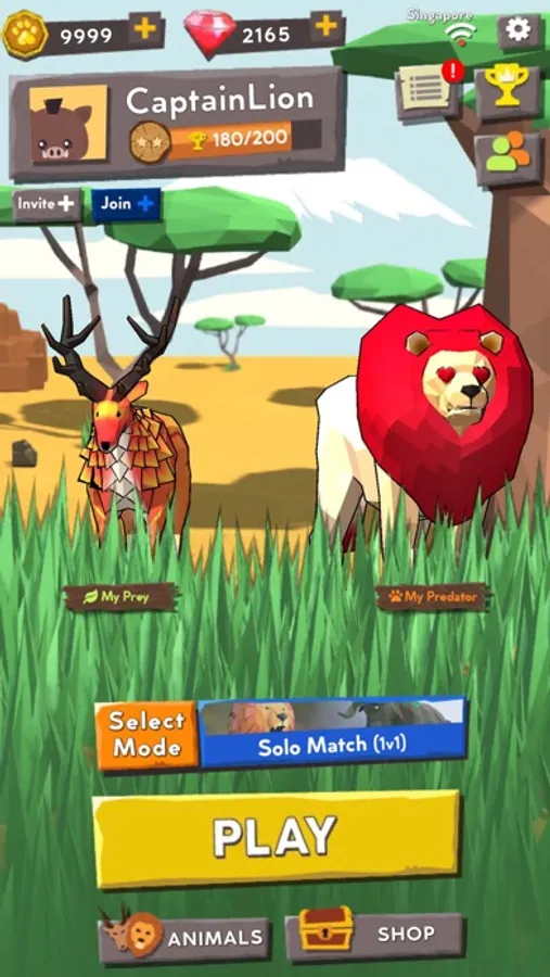 Invite and play against friends or choose a random opponent from the savanna. Choose game mode between 1 vs 1, 2 vs 2 or 3 vs 3. Before each round you select which animals you want to play with. As a predator you have to capture the prey before they have eaten their grass. As a prey you must avoid the sneaky predator while eating the greenest grass to gain full food bar fast.