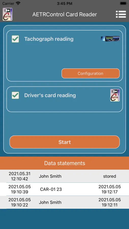 Reading of G1, G2 and G2v2 driver cards with the AETRControl Front device and using supported card readers (Feitian, acs) and uploading its storage to the address www.aetrcontrol.eu.