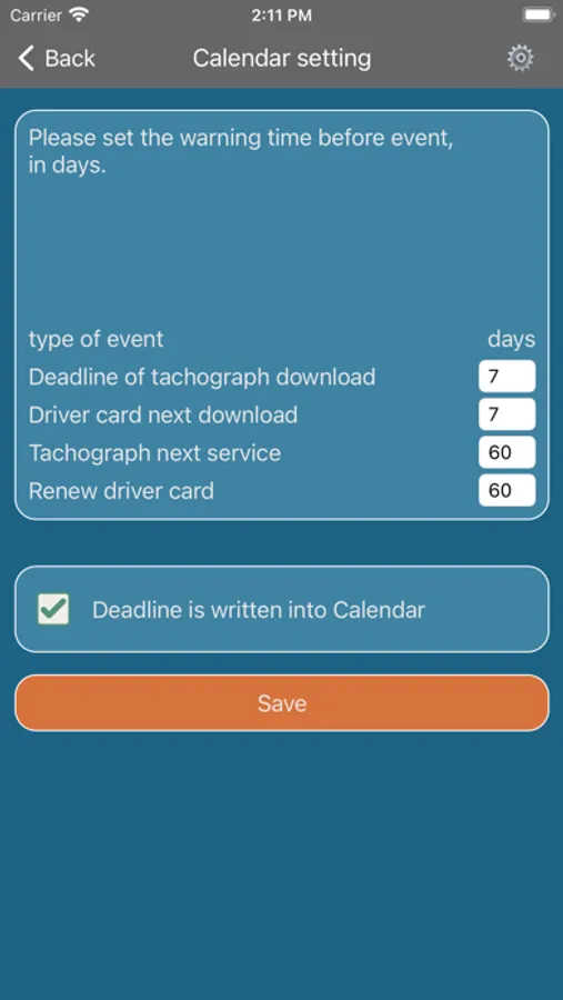 Displaying the next tachograph and driver card reading, tachograph service, and driver card renewal deadlines in the application and in the Calendar.