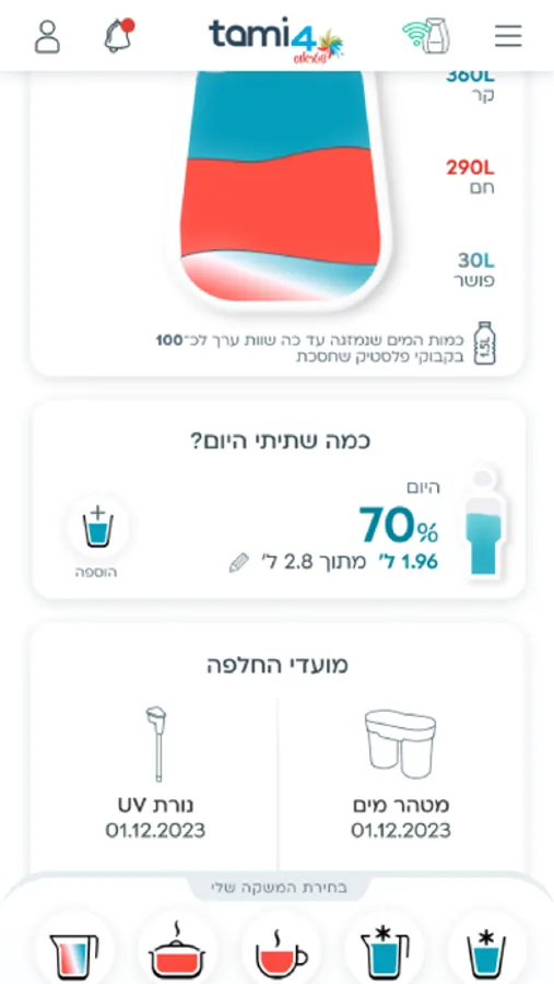 A new and improved updated version for our Tami4edge and Tami4edge+ App.The App lets you control the Water Bar remotely and a joyful drinking experience.This new version includes a whole new design as well as a couple of new and improved features such as an easier paring process, real-time alerts on tami4maze™ filter replacement and the UV lamp, malfunctions alerts, customized personal drinks, water drinking consumption for you and your family and even a daily drinking goal monitoring