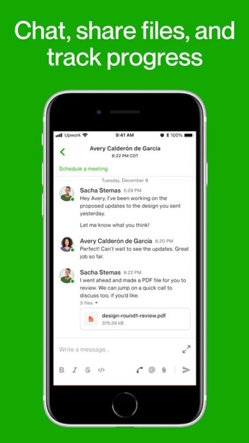 Use Upwork to chat or video call, share files, and track project milestones from your desktop or mobile device.