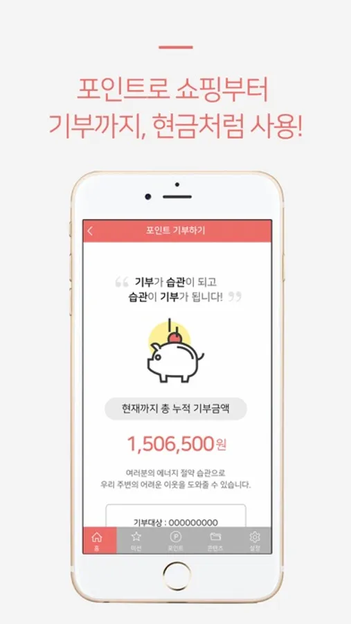 미션을 통해 적립한 포인트는 강원마트에서 현금처럼 사용하거나 취약계층을 위해 기부할 수 있어요!