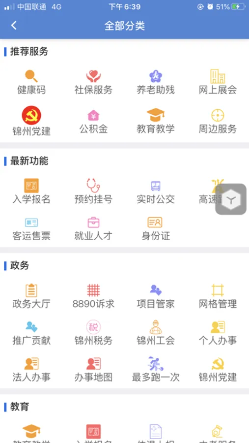 教育类:学区范围、在线阅读、名师课堂、家校通知、成绩查询、教育缴费。