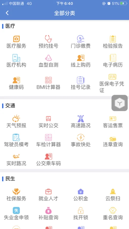以便民100服务清单为核心,按照:政务服务、交通出行、文化教育、医疗卫生、公安服务、社会保障、民生服务、公共支付、公共资源交易、互动交流、公益服务总共11大类进行全方位规划,涵盖了平台的所有服务,用户可根据个人喜好,选择需要的应用,进行关注定制。