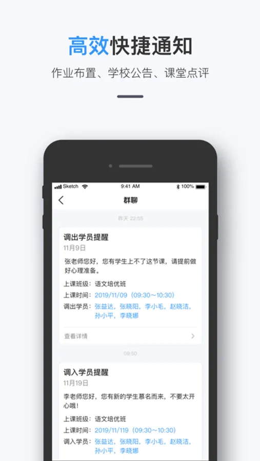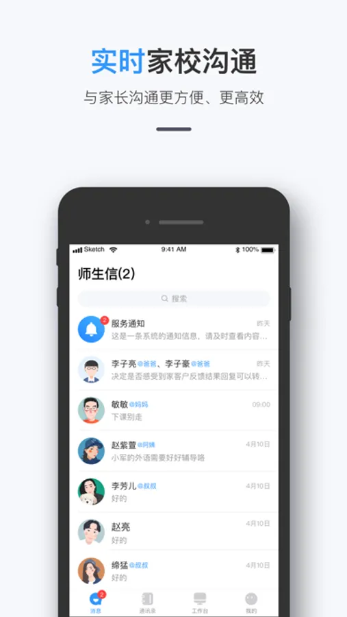 师生信是一款家校即时沟通交流应用软件,师生信作为学校或机构与家长和学员沟通的桥梁,解决了以往培训学校校长、老师、家长的诸多痛点问题。校长可以通过师生信应用查看各类经营报表;老师可以通过师生信对学生进行点名签到,给学生发评语、布置作业,灵活而方便;家长可以通过师生信及时收到孩子的到校、离校消息,随时查看孩子学习成绩、上课评语及学校的各种通知等,贴心而及时。