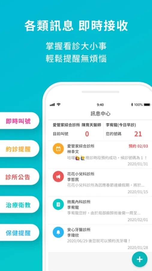 讓您接收『各類診所通知』,『線上即時預約』,『掌握現場叫號』,『照顧多位家庭成員』。
