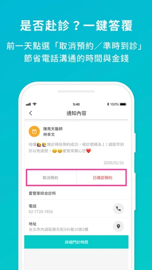 約診通知-看診前發送約診提醒,診所資訊一清二楚;